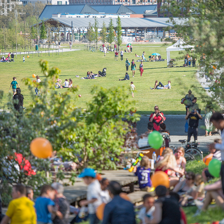 Joggers, cyclists and passers-by will love it. Families with children will find the safety to let their young ones play in all liberty. Numerous bicycle sheds – on the site but also in each building – and pathways encourage both residents and employees on the site to make use of their bicycles more often.